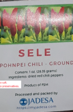 Sele (red chili pepper - ground) is Pohnpei's hot chili pepper grown in the lush tropical lowlands of Pohnpei. The chili peppers are hand-picked for freshness and sun-dried for preservation. This hot ground chili pepper contains no salt and no preservatives, guaranteeing all natural flavors and ingredients.